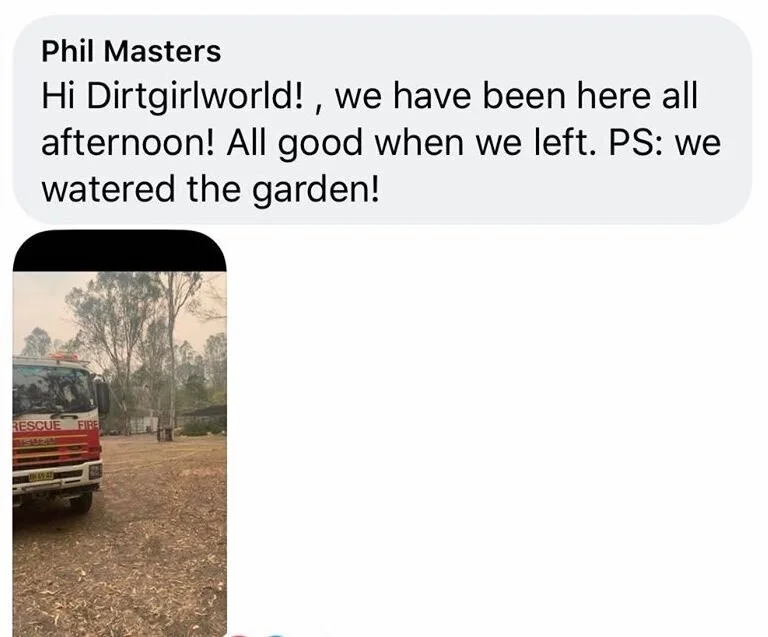 For many days the NSW Rural fire service protected and cared for dirtgirlworld. They even had time to post messages on our facebook page so we knew what was going on.